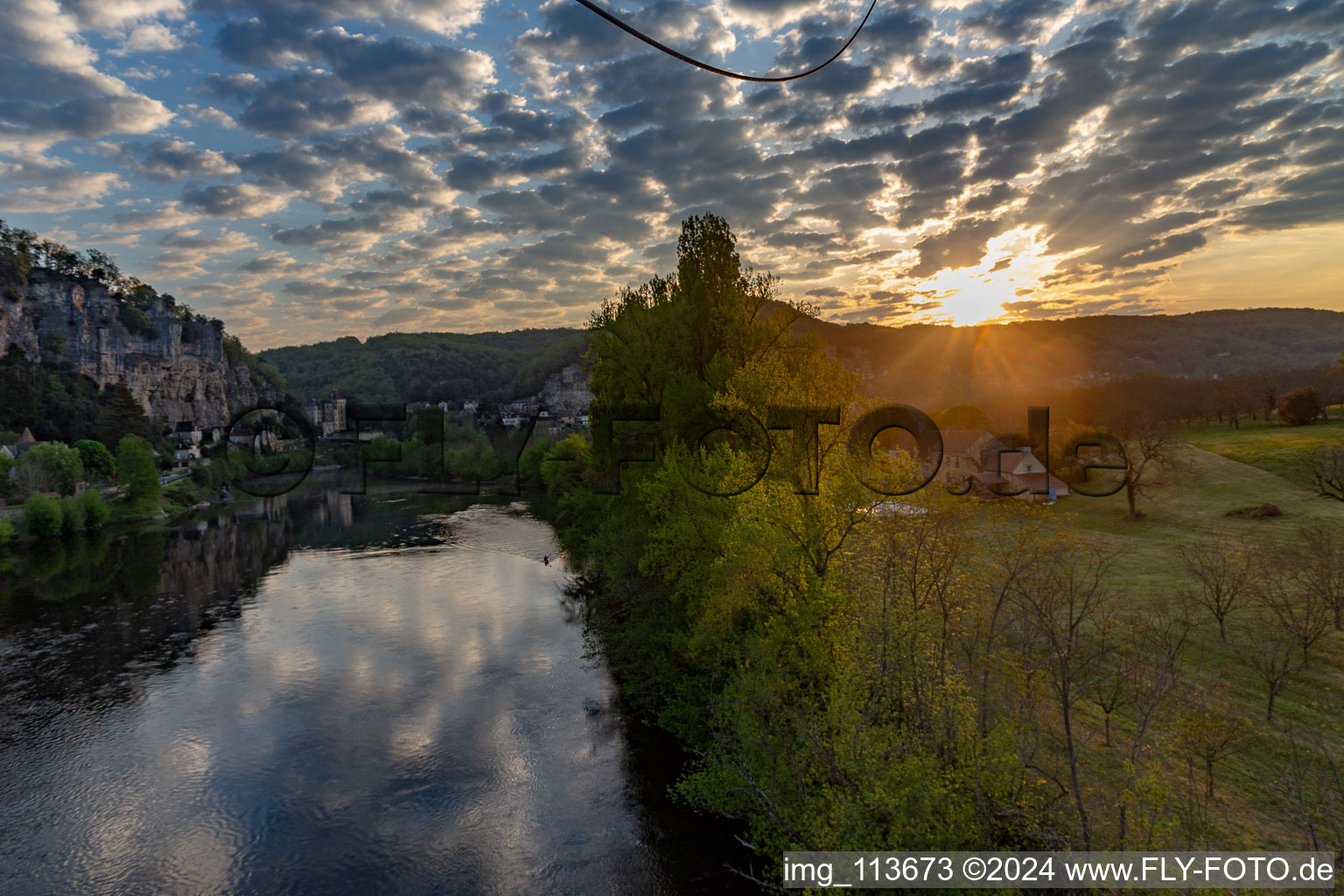 Vue aérienne de Château de la Malartrie au lever du soleil sur la Dordogne à La Roque-Gageac dans le département Dordogne, France prise le 20/04/2019 numéro d'image: 113673