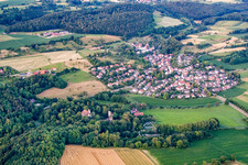 Vue aérienne de Les champs devant le lac de Constance enveloppés dans le brouillard matinal à le quartier Möggingen in Radolfzell am Bodensee dans le département Bade-Wurtemberg, Allemagne prise le 26/08/2017 numéro d'image: 102882