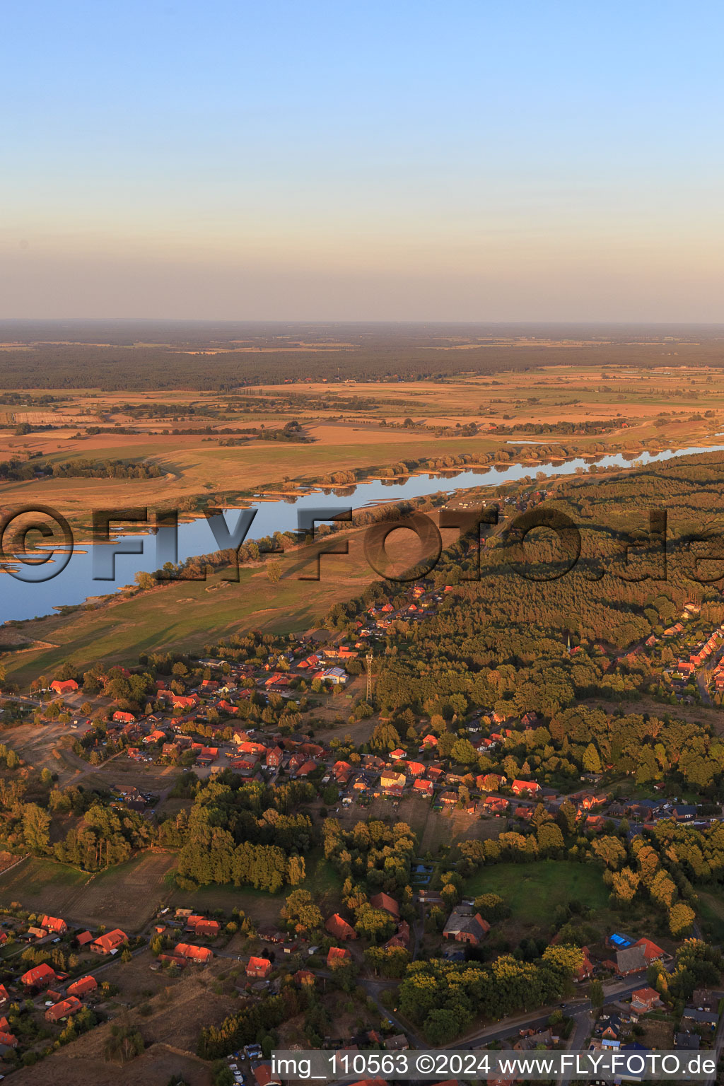 Vue aérienne de Vue de la ville sur les rives de l'Elbe depuis l'ouest à Neu Darchau dans le département Basse-Saxe, Allemagne prise le 21/08/2018 numéro d'image: 110563