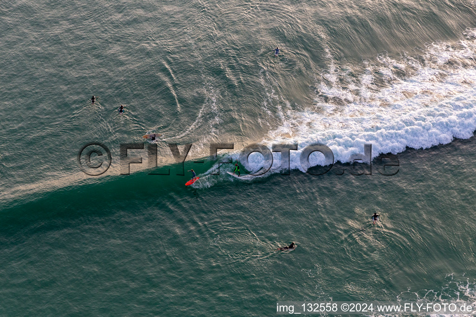Vue aérienne de Wave surfeurs devant la Plage de Tronoën/Bretagne à Saint-Jean-Trolimon dans le département Finistère, France prise le 17/06/2022 numéro d'image: 132558